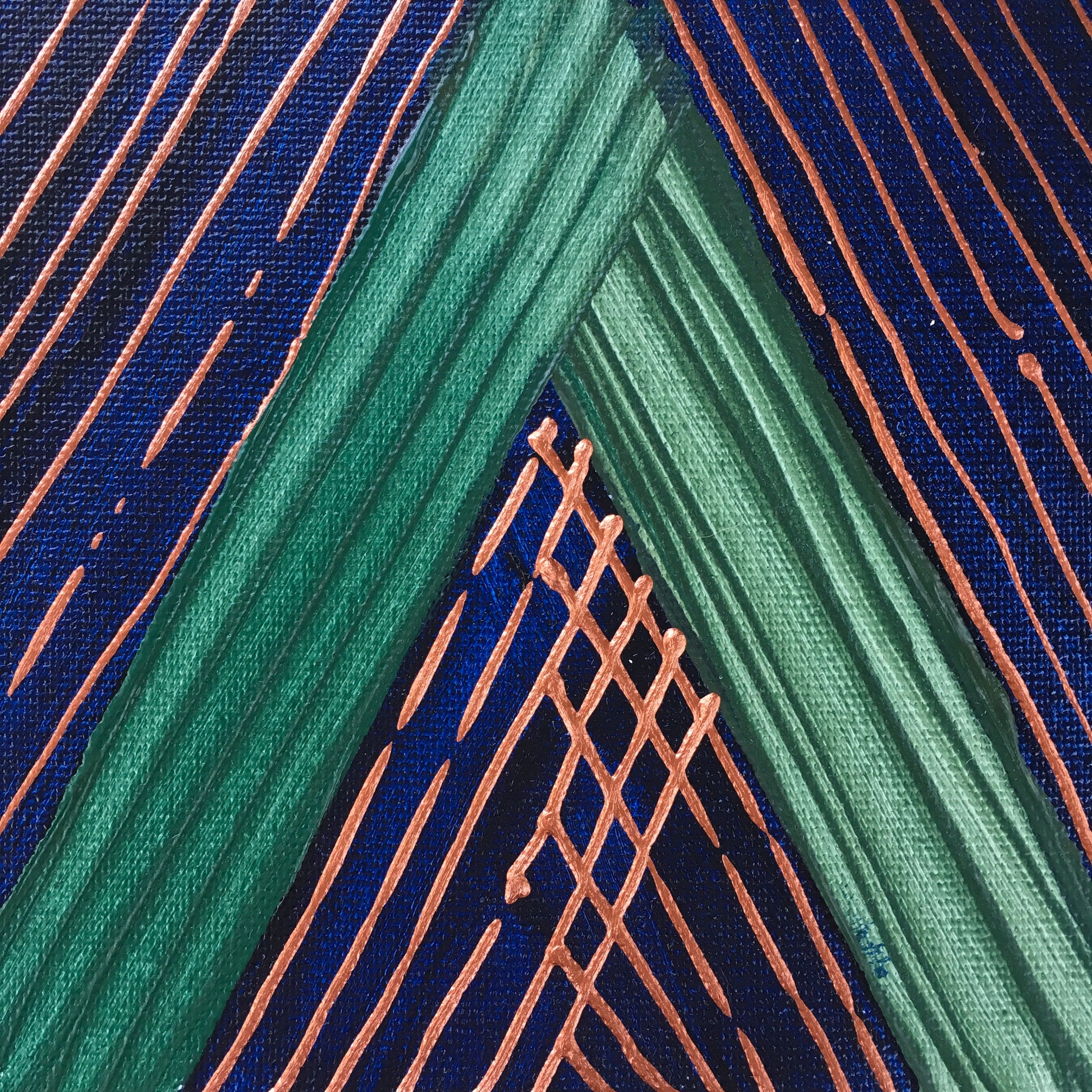 Hand-painted canvas stitched to cotton paper measures 7 by 5 inches.