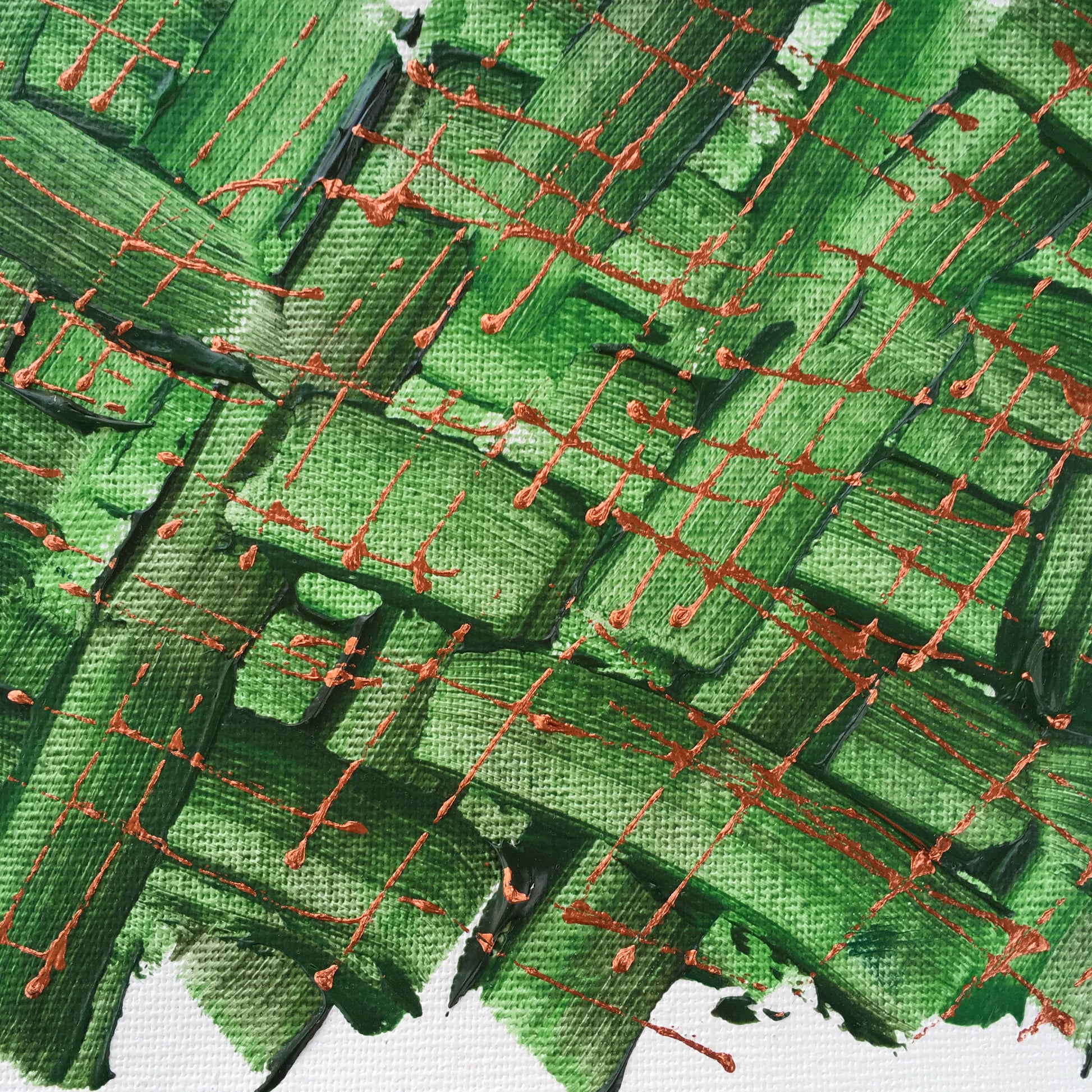 Hand-painted canvas stitched to cotton paper measures 7 by 5 inches.