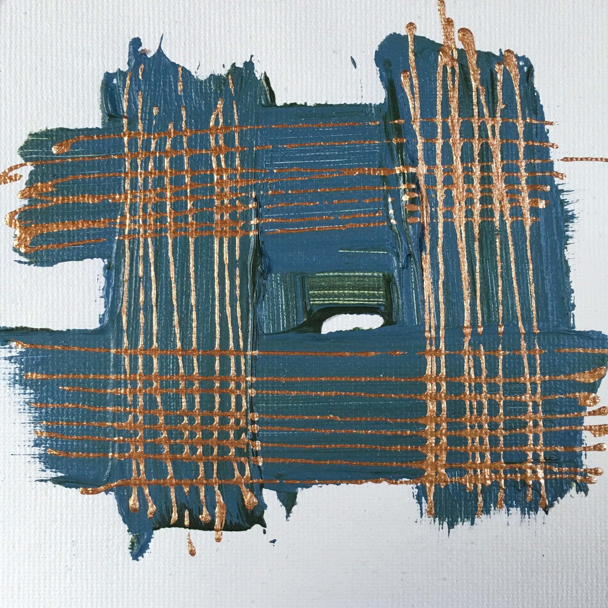 Hand-painted canvas stitched to cotton paper measures 7 by 5 inches.